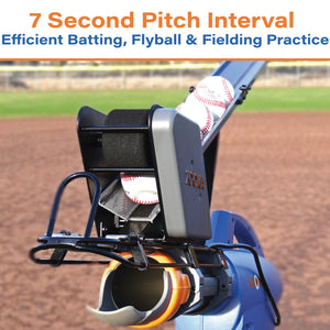 Throws baseballs, dimple balls, tennis balls and soft-core safety balls