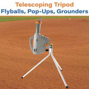 Adjustable speed pitching machine from 10-50 mph. Telescoping tripod throws grounders, fly balls, line drives and strikes for batting practice. Comes with a tall tripod, designed to replicate pitch release height for youth players 8 years to adults!